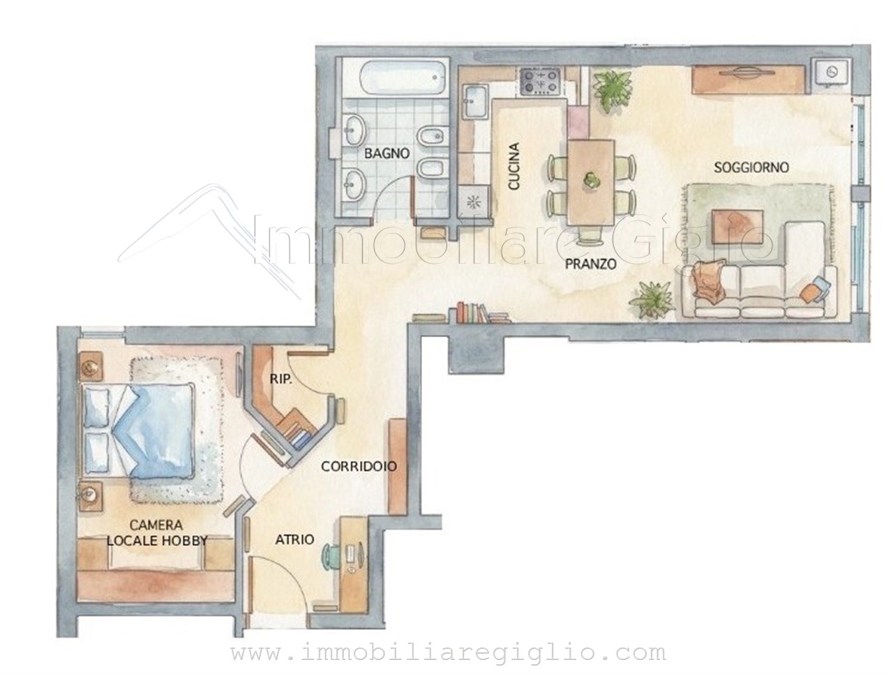 . Atrio, luminoso soggiorno con angolo cottura, servizio, ripostiglio, locale hobby adibito a camera.